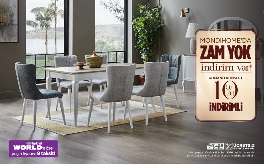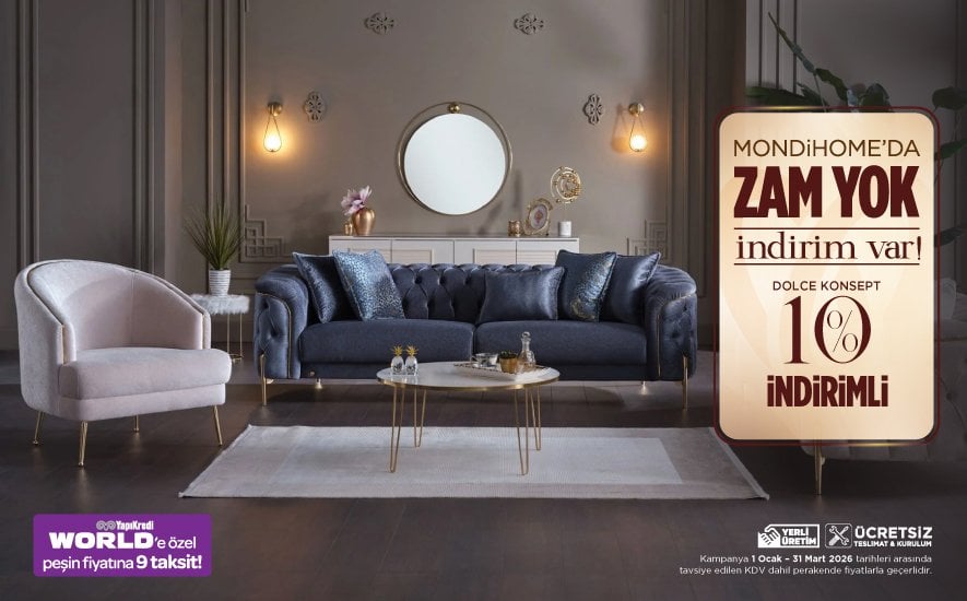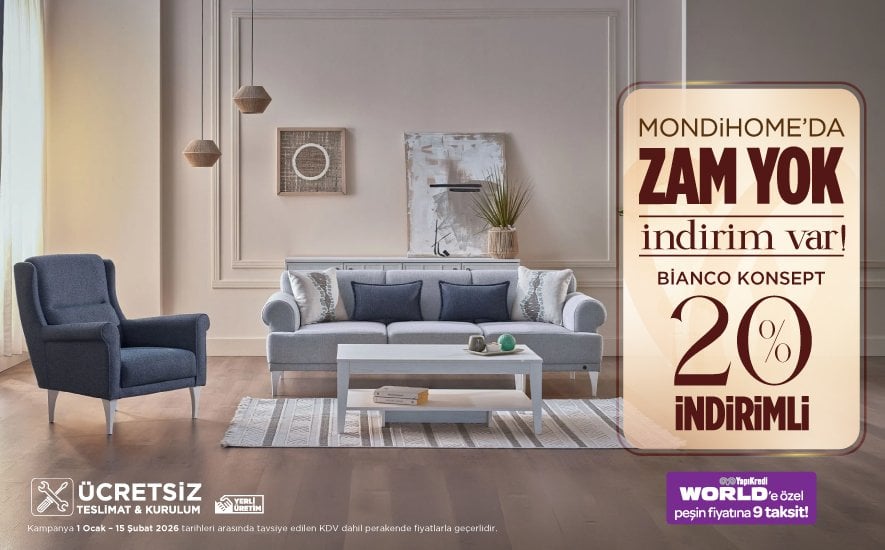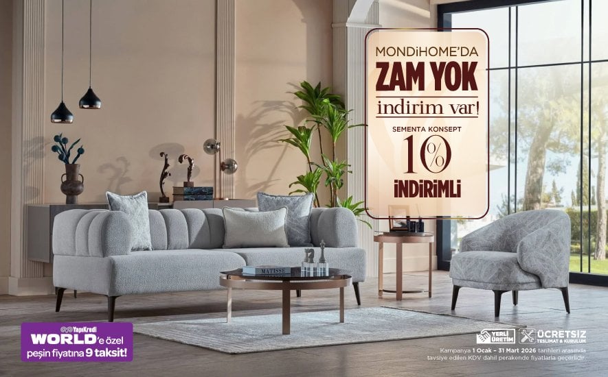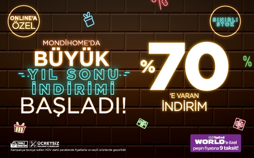 Mondihome kalitesi ve şıklığına uygun fiyatlarla ve kaçırılmayacak kampanyalarla sahip olabilirsiniz. Birbirinden rahat yataklar, yatak odanızın havasını değiştirecek şık bazalar, rahatlık, konfor ve evinize şıklık katan koltuklar ile evinizin havasını değiştirmek için sizde kampanyalarımızdan yararlanabilirsiniz. Belirtilen fiyatlar KDV dahil tavsiye edilen perakende satış fiyatlarıdır. Ürünlerin üretim yeri Türkiyedir. KDV ve diğer vergi oranlarında olabilecek değişiklikler fiyatlara aynen yansıtılacaktır. Bu kampanya başka kampanyalarla birleştirilemez. Kampanyayı belirtilen tarihten önce sona erdirme hakkımız mahfuzdur.